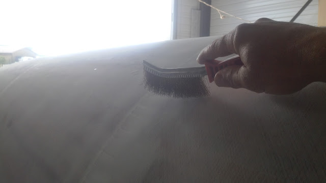 Par contre il ne faut impérativement pas attaquer le tissus de verre au ponçage, heureusement on a été généreux à l'imprégnation du tissus et on a un film de résine époxy suffisant pour "dérocher" la surface sans attaquer le tissus.